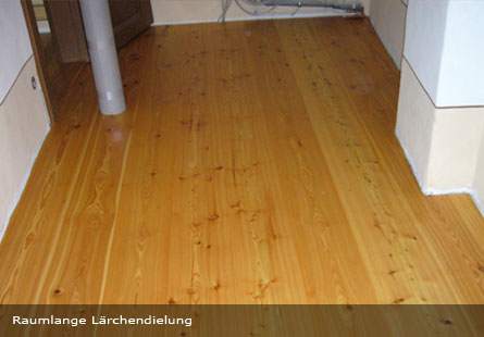 Nach historischer Vorlage wurden neue Dielen in einer Breite von25 cm und raumlang verlegt. Des weiteren wurden in diversen Räumen eine Felderdielungen mit Rahmung aus Eiche und Füllung in Lärche angelegt. Anschließend wurde der Boden geschliffen und mit Öl oberflächenbehandet.